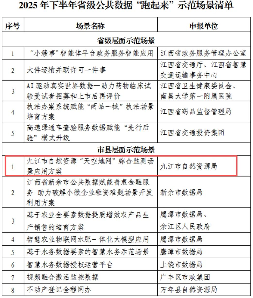 九江市自然资源“天空地网”综合监测场景应用方案入选全省首批公共数据“跑起来”示范场景
